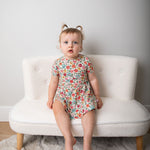 This print has beautiful florals in an array of elegant colours. This dress features a bodysuit underneath with snaps.